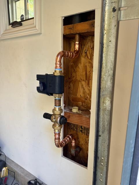 JIG will repair burst water line in wall up to 1" in size and up to 10ft in length. JIG will also supply and install a 1.25" pressure reducing valve and a MoenFlo leak detection device on the home water inlet in the garage by opening drywall to access the piping and plumb the items in place inside of the garage. We also inspected and diagnose for leaks, No leaks. New water pressure on PRV was adjusted and set between 70-75psi.